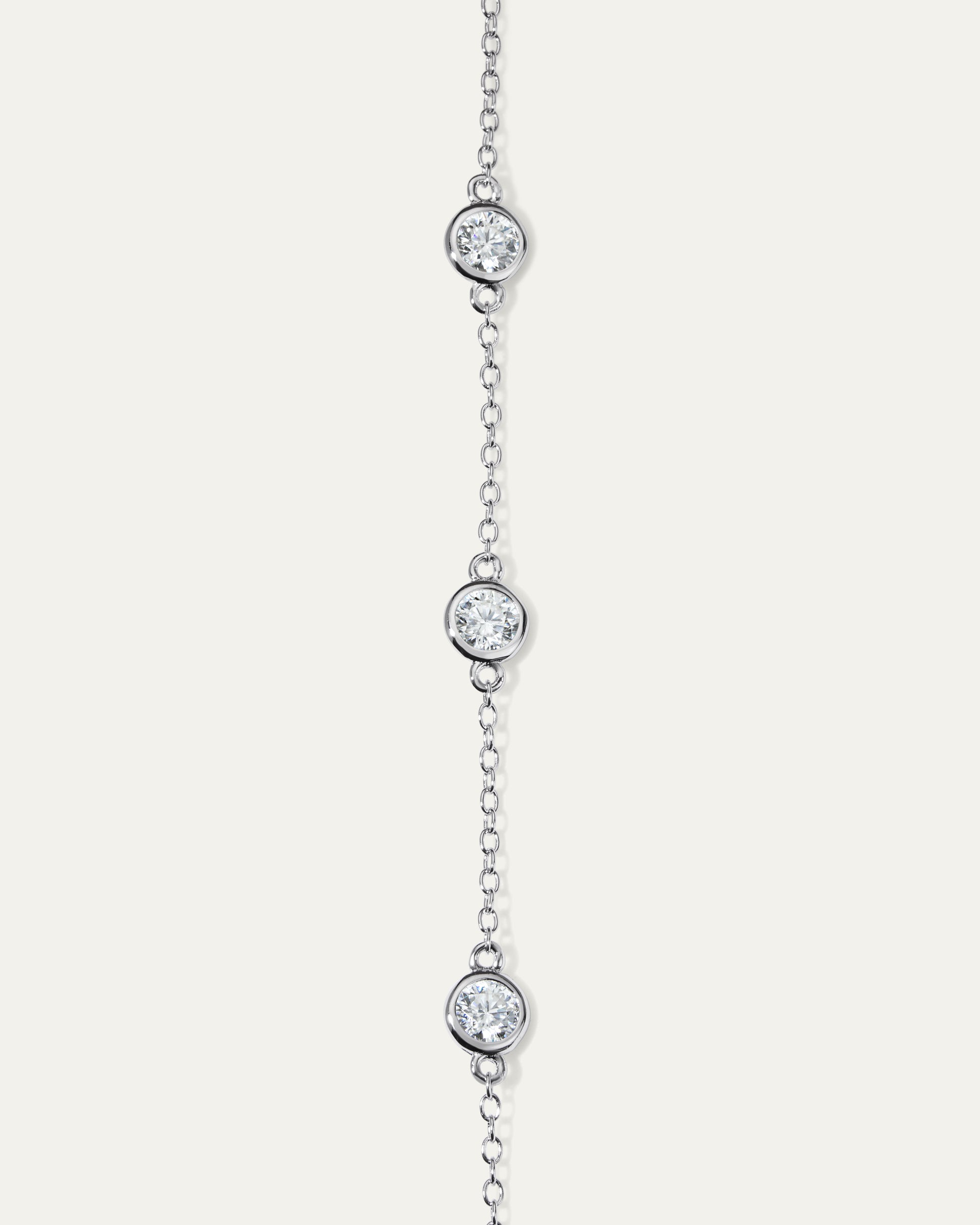 A modern classic, the Charlotte Bezel Station Bracelet features delicately set round stones spaced along a fine, luminous chain. Each bezel-set stone catches the light with effortless sparkle, creating a look that’s refined, timeless, and perfect for everyday wear or subtle layering.