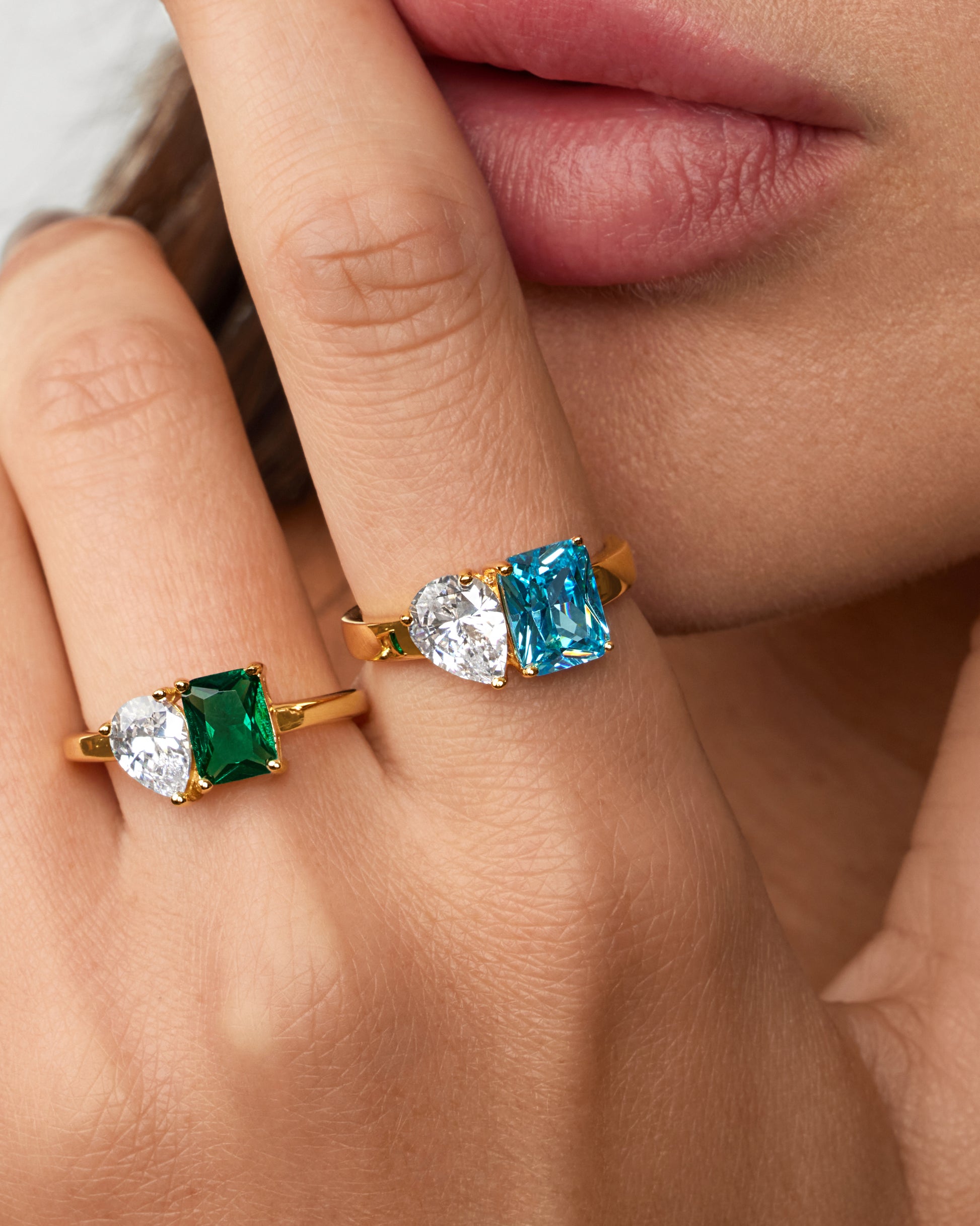Masterfully handcrafted in solid 925 sterling silver and rich 14-karat yellow gold vermeil styles, it pairs an emerald-cut blue topaz with a pear-cut cubic zirconia.