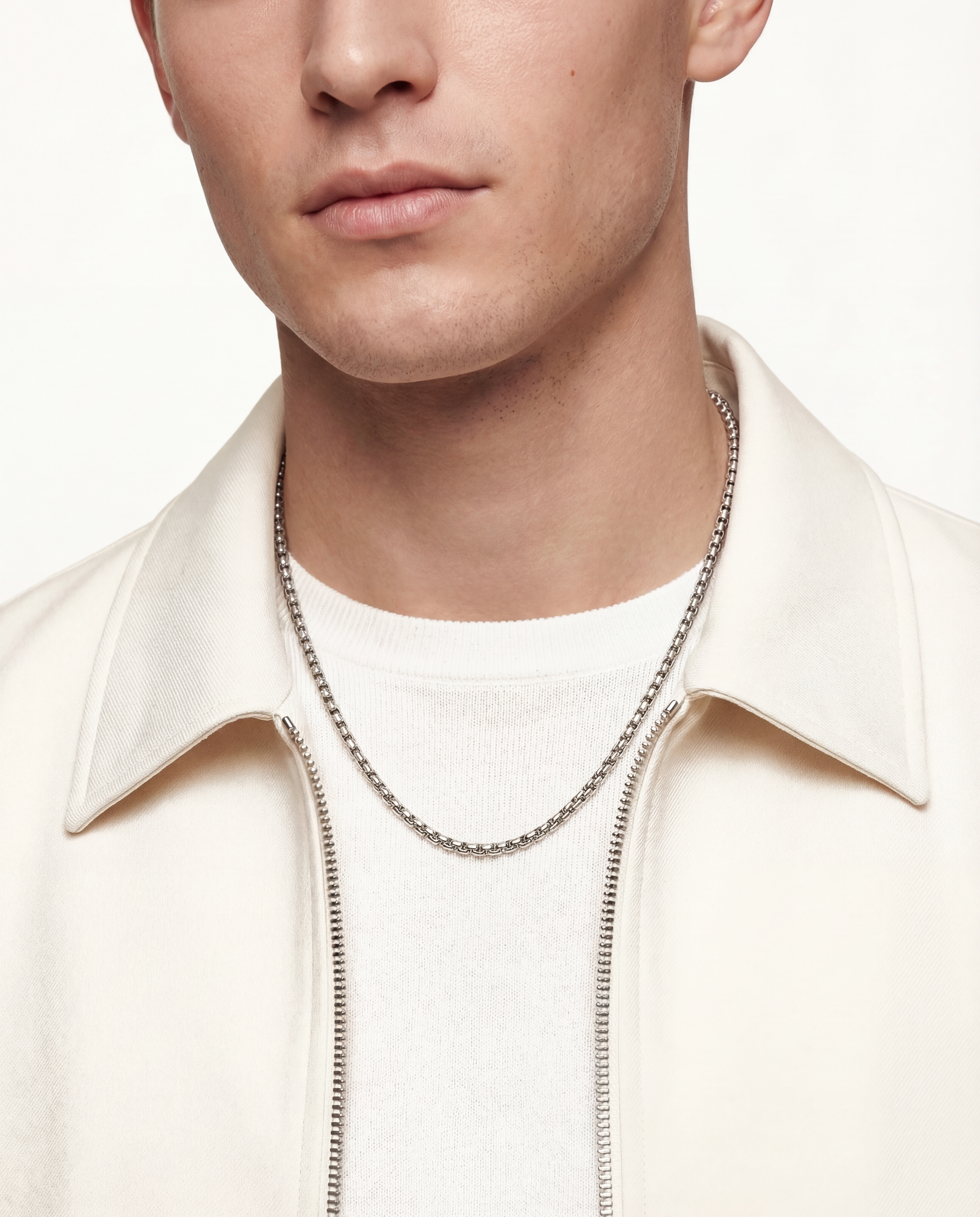 The perfect accessory for the modern gentleman, our Box Chain Necklace is an essential, combining timeless design with expert craftsmanship. Its round, interlocking links create a smooth and durable chain, handcrafted in 925 sterling silver for lasting shine and lightweight comfort.