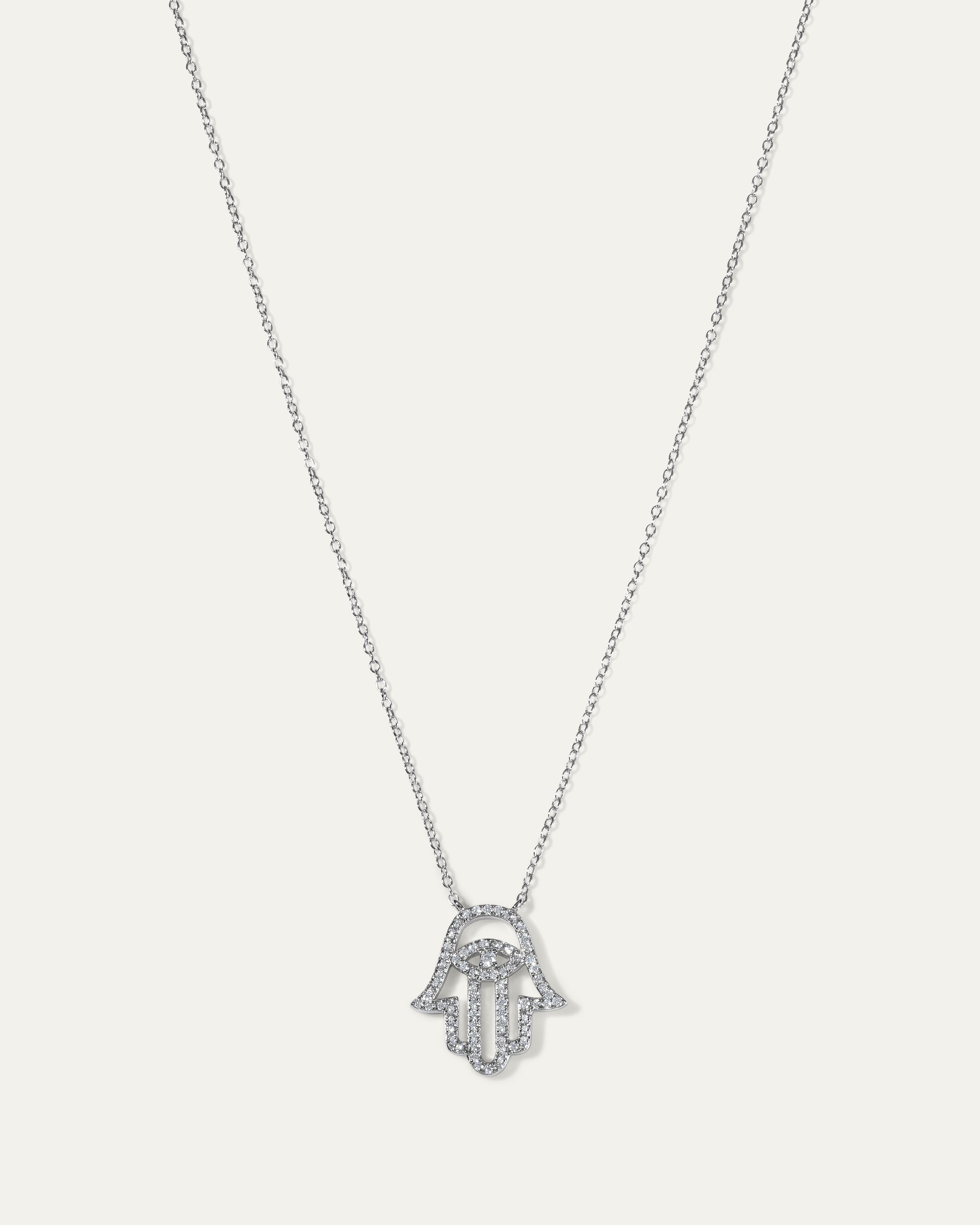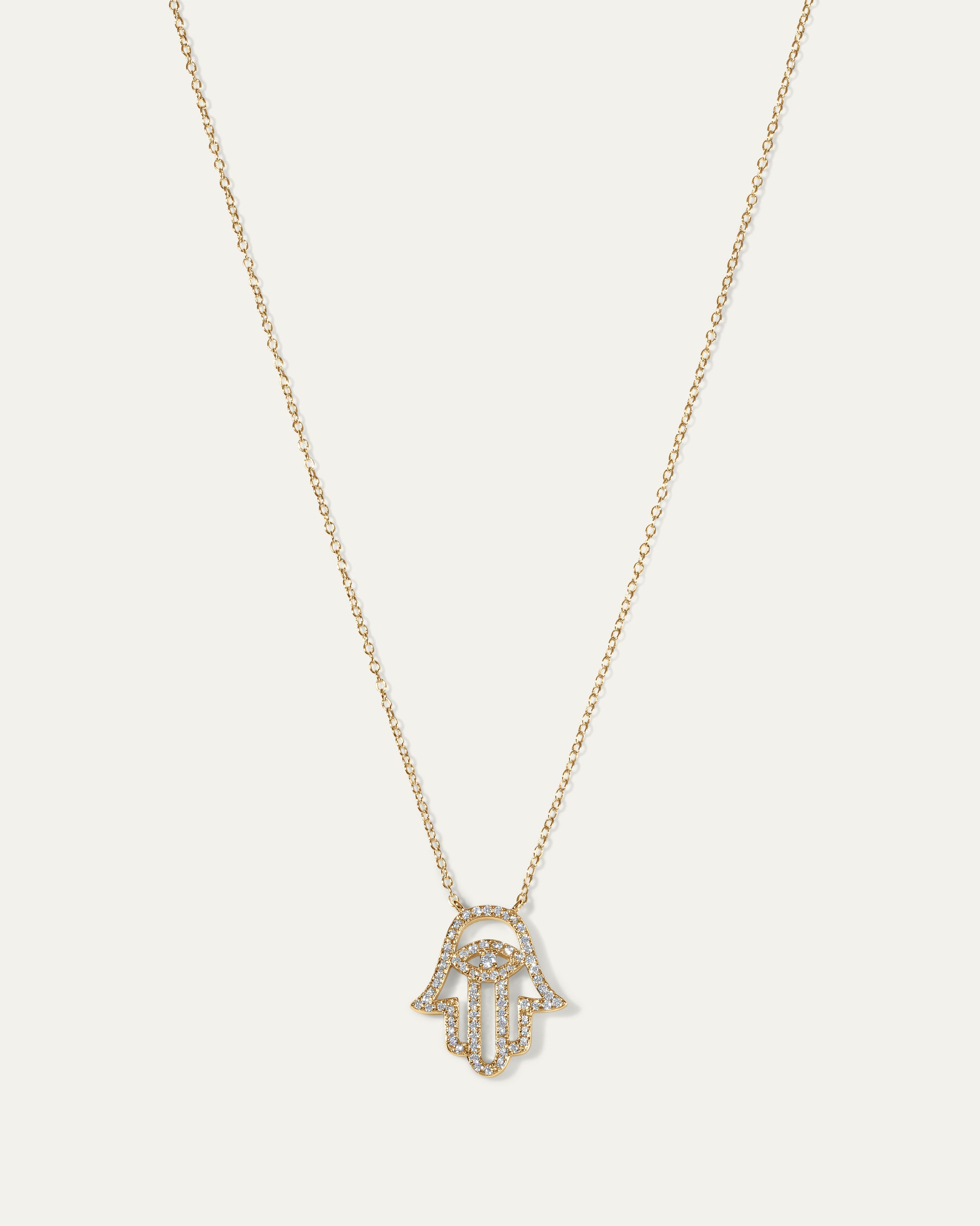 The Hamsa Necklace is a timeless statement of rich symbolism and luxurious design. An emblem for safety and good fortune, the talisman has a small, intricate Evil Eye motif nestled within.