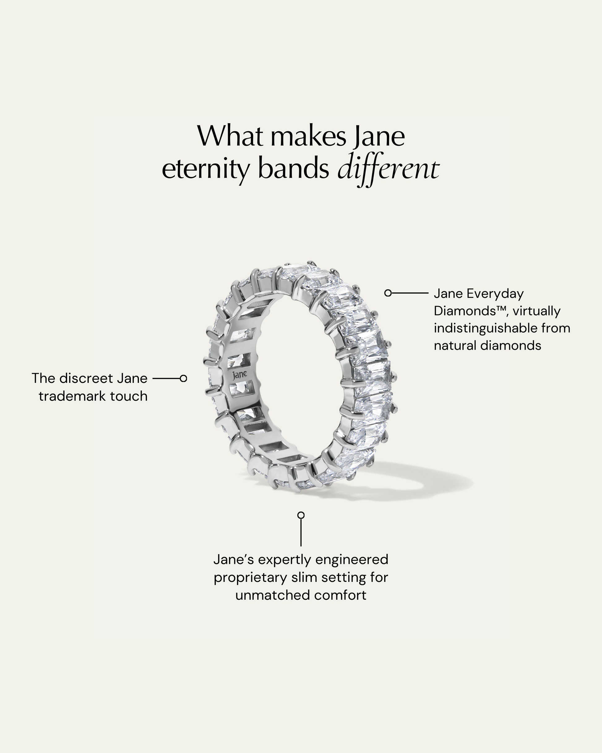 The Jane Everyday™ Comfort Baguette Eternity Band brings an eternity of baguette-cut brilliance to your daily ensemble. Featuring a continuous row of delicately set baguette-cut Jane Everyday Diamonds™, our signature prong-set moissanite with exceptional clarity and color, the stones are virtually indistinguishable from natural diamonds.